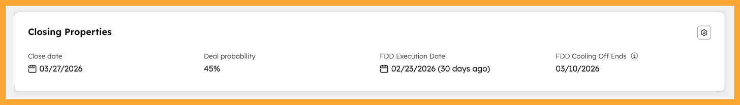 Then if your Close Date is before your FDD Cooling Off Ends for the Deal, you can automatically push the Close Date out with an automation. It’s a little more configuration but the accurate reporting you get out of it worth the minor effort.